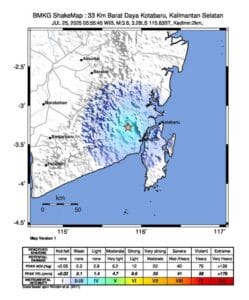 Gempa bumi tektonik dengan magnitudo 3,6 mengguncang wilayah Kotabaru, Kalimantan Selatan, pada Jumat (25/7/2025) pukul 05.55 WIB. Badan Meteorologi, Klimatologi, dan Geofisika (BMKG) mencatat episenter gempa berada pada koordinat 3,28 Lintang Selatan dan 115,83 Bujur Timur, atau sekitar 33 kilometer barat daya Kotabaru, dengan kedalaman dangkal hanya 2 kilometer.