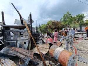 Tiga kios yang terbakar, posisinya memang berdempetan dan terbuat dari kayu. Material kayu dan bahan yang ada di dalam masing-masing kios menyebabkan api dengan cepat membesar. Nur mengaku tak banyak menyelamatkan barang-barang di dalam kios. Akibatnya, sejumlah besar barang dagangan, termasuk satu unit mesin pompa bensin, empat lemari es, dan sebuah motor ludes dilalap api. “Kerugian bisa sampai Rp100 juta,” ucap Nur dengan mata berkaca.