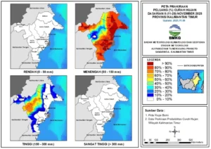 “Kabupaten Kutai Barat bagian utara, Kutai Kartanegara bagian utara, Kutai Timur bagian barat, Berau bagian barat, dan Mahakam Ulu bagian selatan diprakirakan mengalami curah hujan dengan kategori tinggi (150–300 mm) dengan peluang hujan berkisar antara 60–90 persen,” terang Riza dalam keterangan resminya, Rabu (12/11/2025).