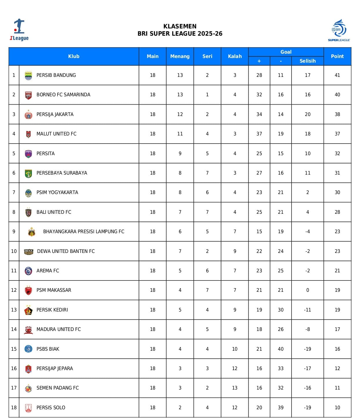 JAKARTA – Persaingan di papan atas klasemen BRI Super League 2025/2026 semakin ketat setelah rangkaian pertandingan pekan ke-18 resmi berakhir pada Senin (26/1/2026) malam. Persib Bandung berhasil merebut posisi puncak klasemen sementara dengan koleksi 41 poin, unggul tipis satu angka dari pesaing terdekatnya, Borneo FC Samarinda.