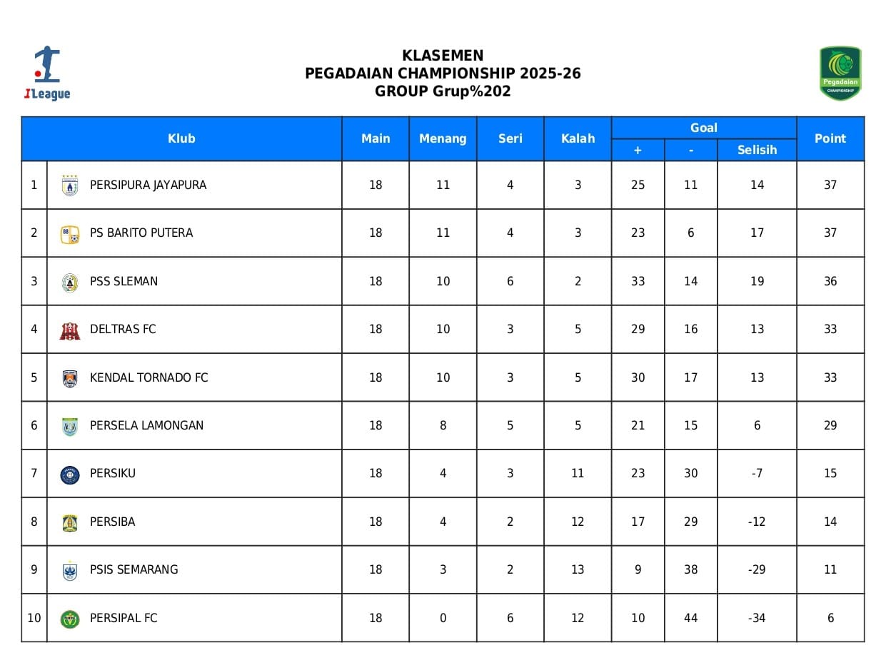JAKARTA – Persaingan di Grup 2 (Grup Timur) Pegadaian Championship 2025/2026 mencapai puncaknya pada pekan ke-18 yang berlangsung dari 29 hingga 31 Januari 2026. Persipura Jayapura berhasil mengukuhkan diri di posisi teratas setelah memetik poin penuh di laga tandang, sementara duel sengit antara PSS Sleman dan Barito Putera berakhir tanpa pemenang.